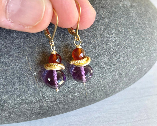 Amethyst and Hessonite Garnet Earrings, February Birthstone, Purple and Orange Dangle Jewelry in Gold or Silver, Gift for her