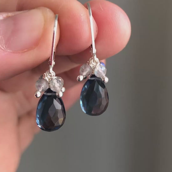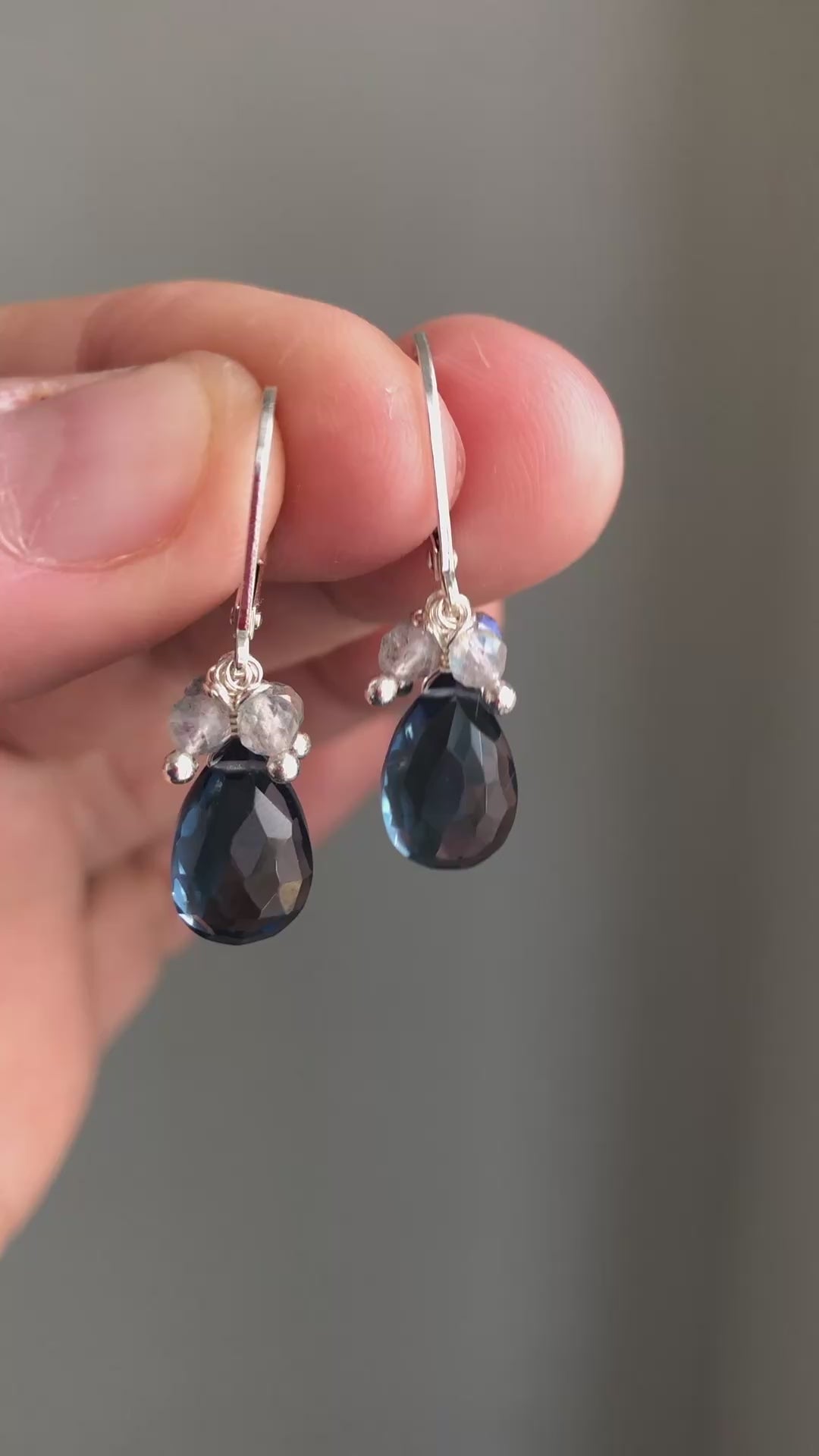 This dainty and elegant pair of earrings features dark blue topaz teardrops topped by 4 small labradorite rondelles, all hand wire wrapped in your choice of gold filled or sterling silver. The earrings are suspended from lever back ear wires. These are perfect dark color earrings or every day earrings if you are into deep blue hues. Ideal Bridesmaid Earrings.