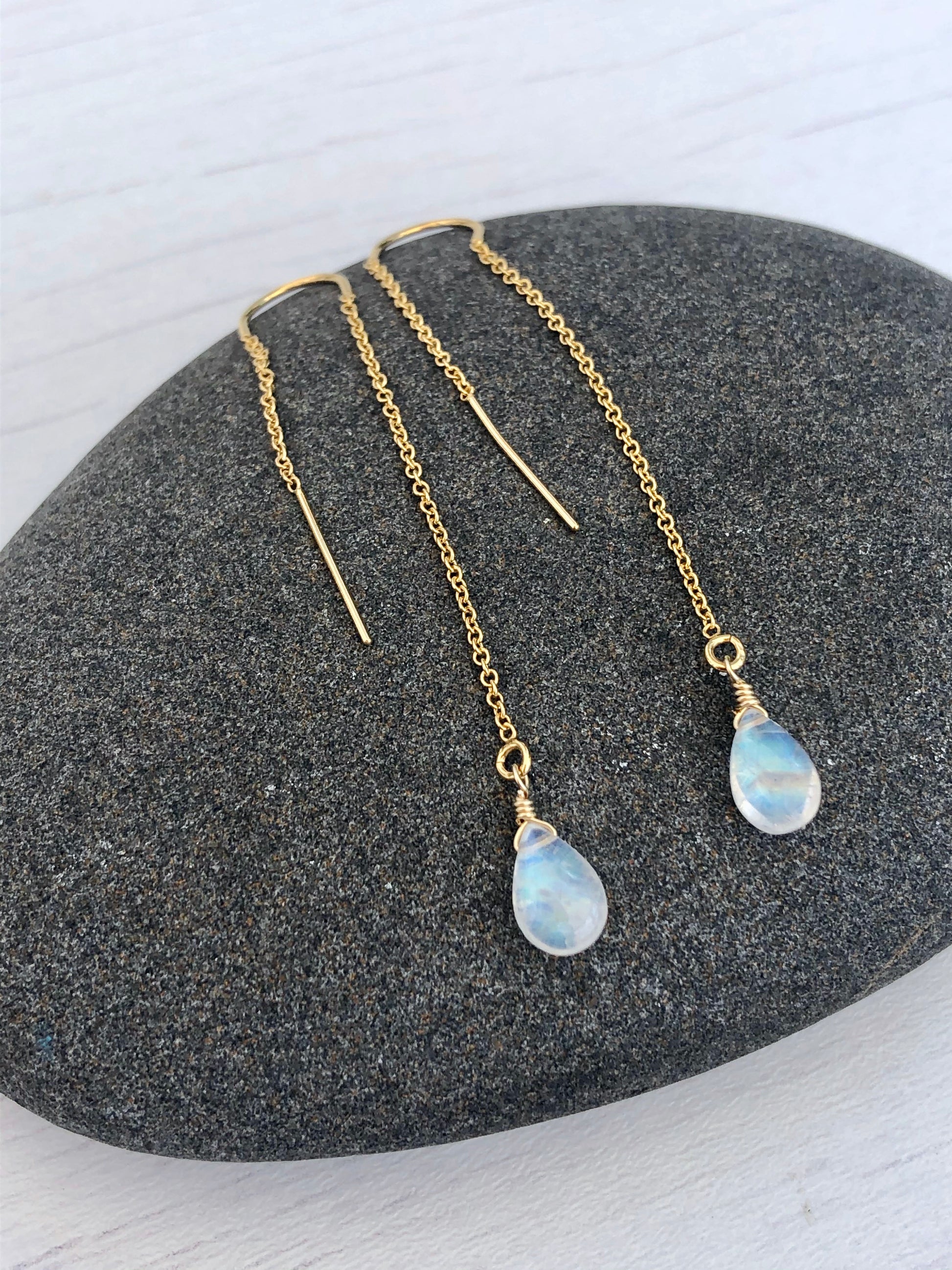 These simple and modern earrings feature flawless smooth rainbow moonstone teardrops wire wrapped and suspended from 14k gold filled or sterling silver ear threaders. Ideal for a modern look, super sleek and minimalist earrings. Great choice for bridesmaids earrings they can continue to use on after a wedding. Perfect earrings for a casual and sexy look.
