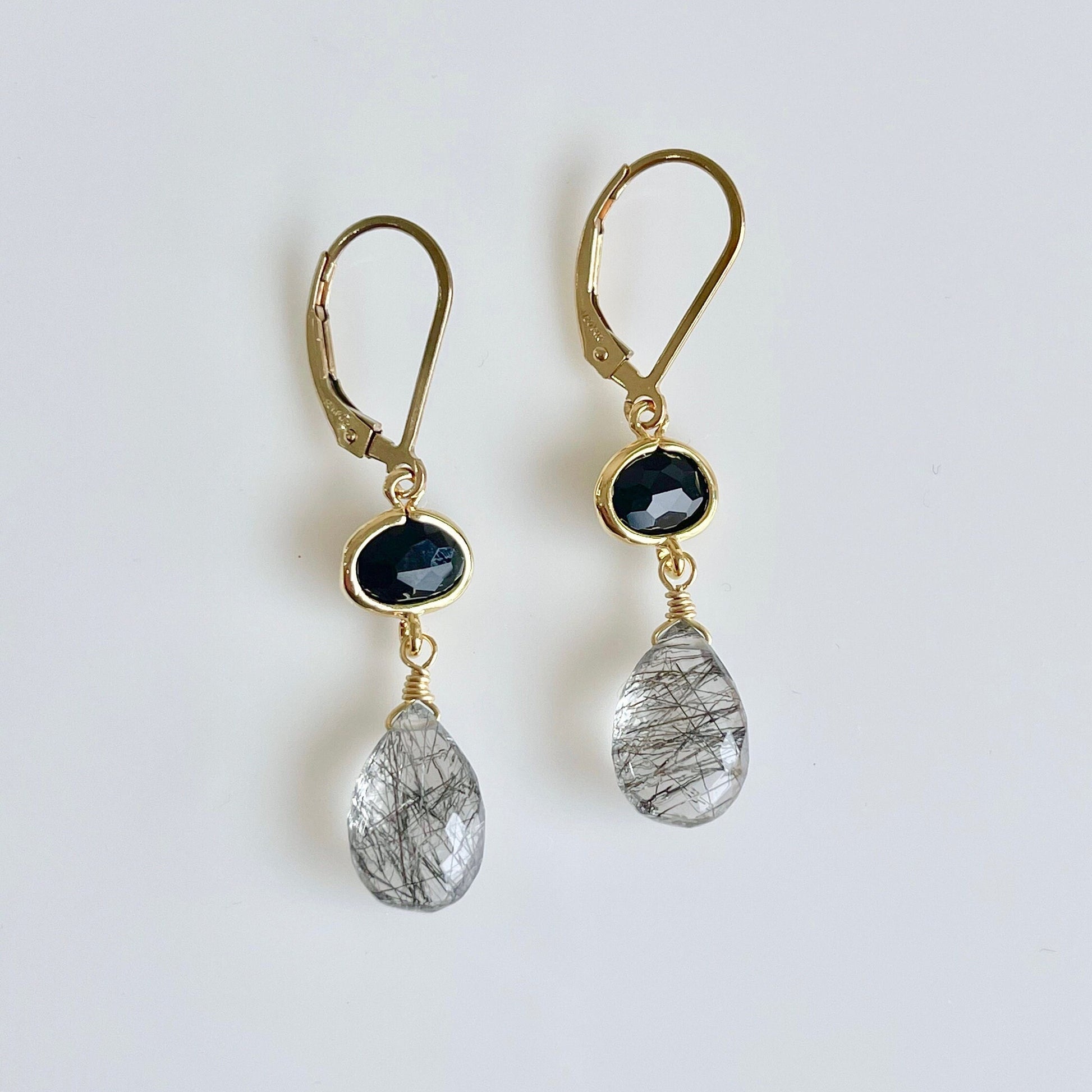 Subdued and classic, these two stone small drop earrings are a staple color combination that just goes withy everything. Featuring flawless quality faceted black rutilated quartz drops wire wrapped to a tiny oval black onyx bezeled connector in your choice of gold filled or sterling silver. The earrings close with lever back ear wires in the finish of your choice.