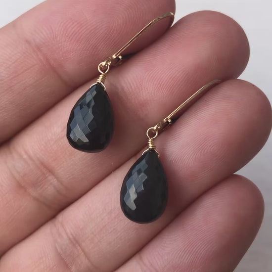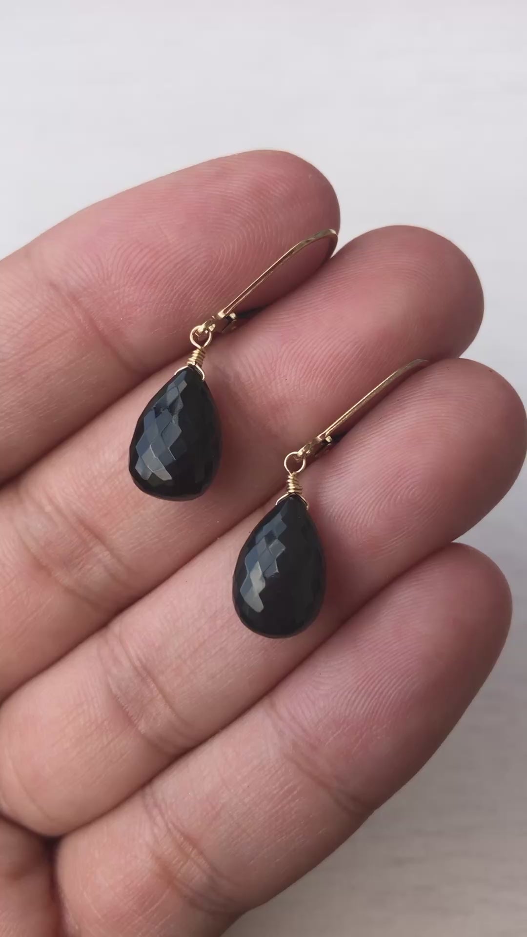 These classic elongated teardrop black earrings feature onyx faceted teardrops wire wrapped in either gold filled or sterling silver. The teardrops are suspended from leverback ear wires in gold filled or sterling silver.