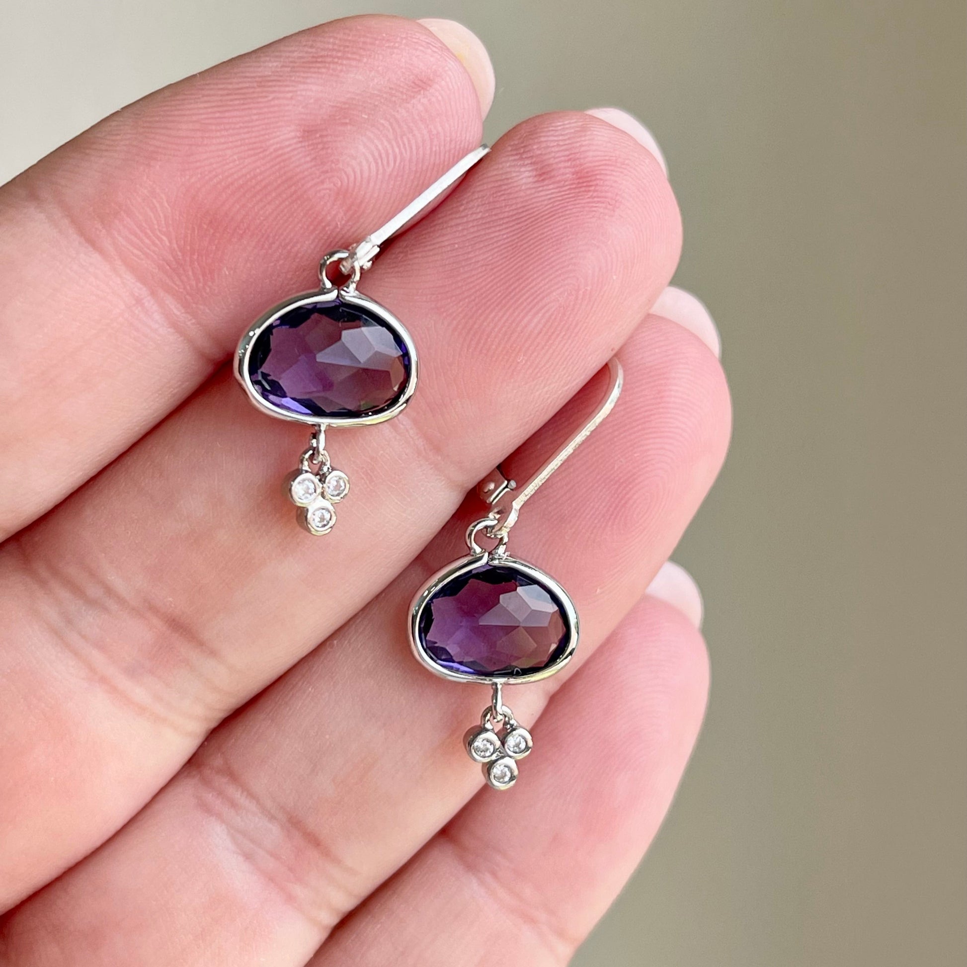 These darling small earrings feature faceted oval Amethyst stones prong set in gold filled or sterling silver. Suspended from the dark purple Amethyst gemstones are delicate gold filled dangle elements with 3 white topaz stones that add great sparkly but hardly any length.
