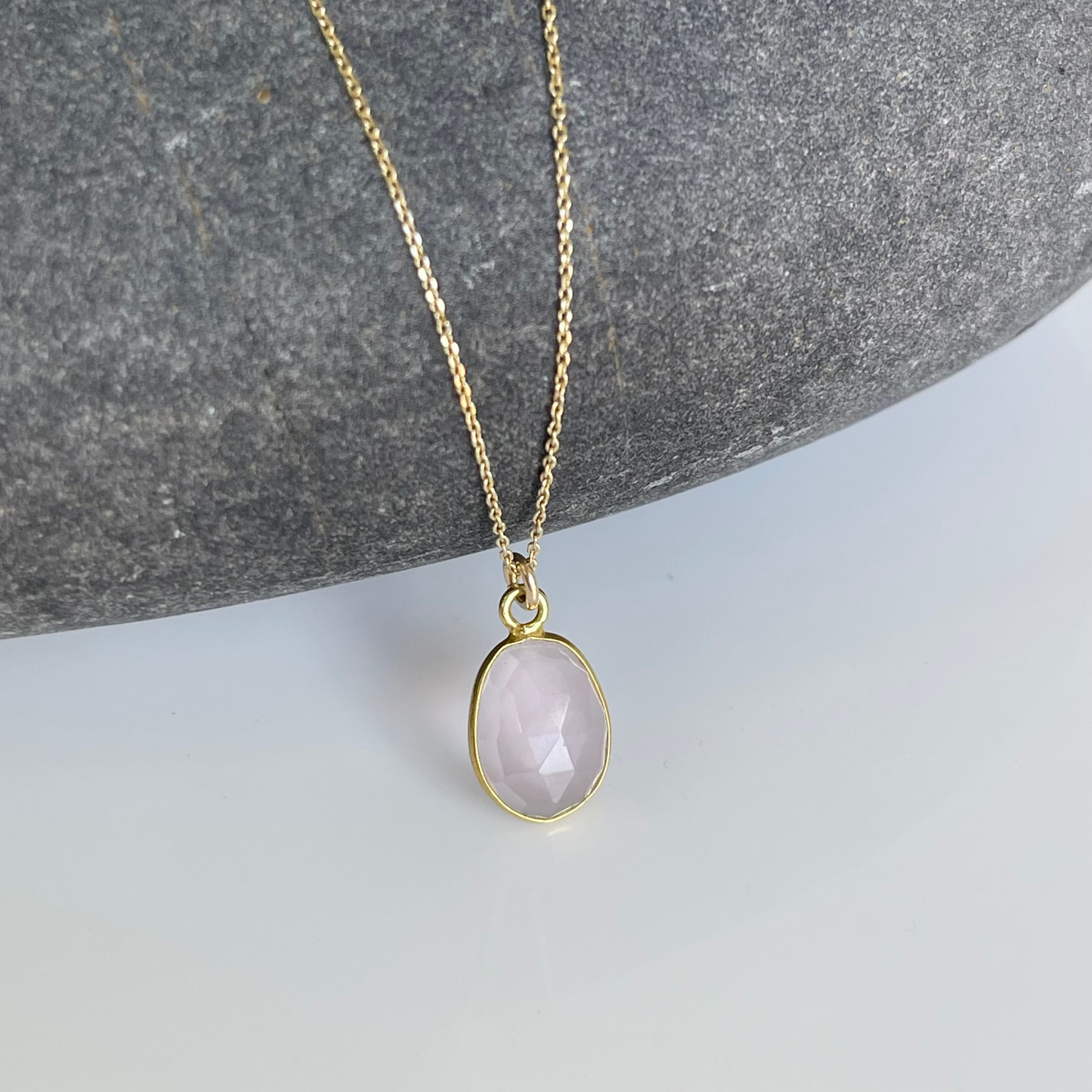 Classic, Minimalist and Every Day Necklace featuring a small pastel pink Rose Quartz oval pendant measuring 10 x 8 mm framed bezeled in solid 14k yellow gold.The subtle, Minimalist pendant is suspended from a dainty solid 14k gold chain. This chain has the three most popular lengths built-in to change whenever you need it.