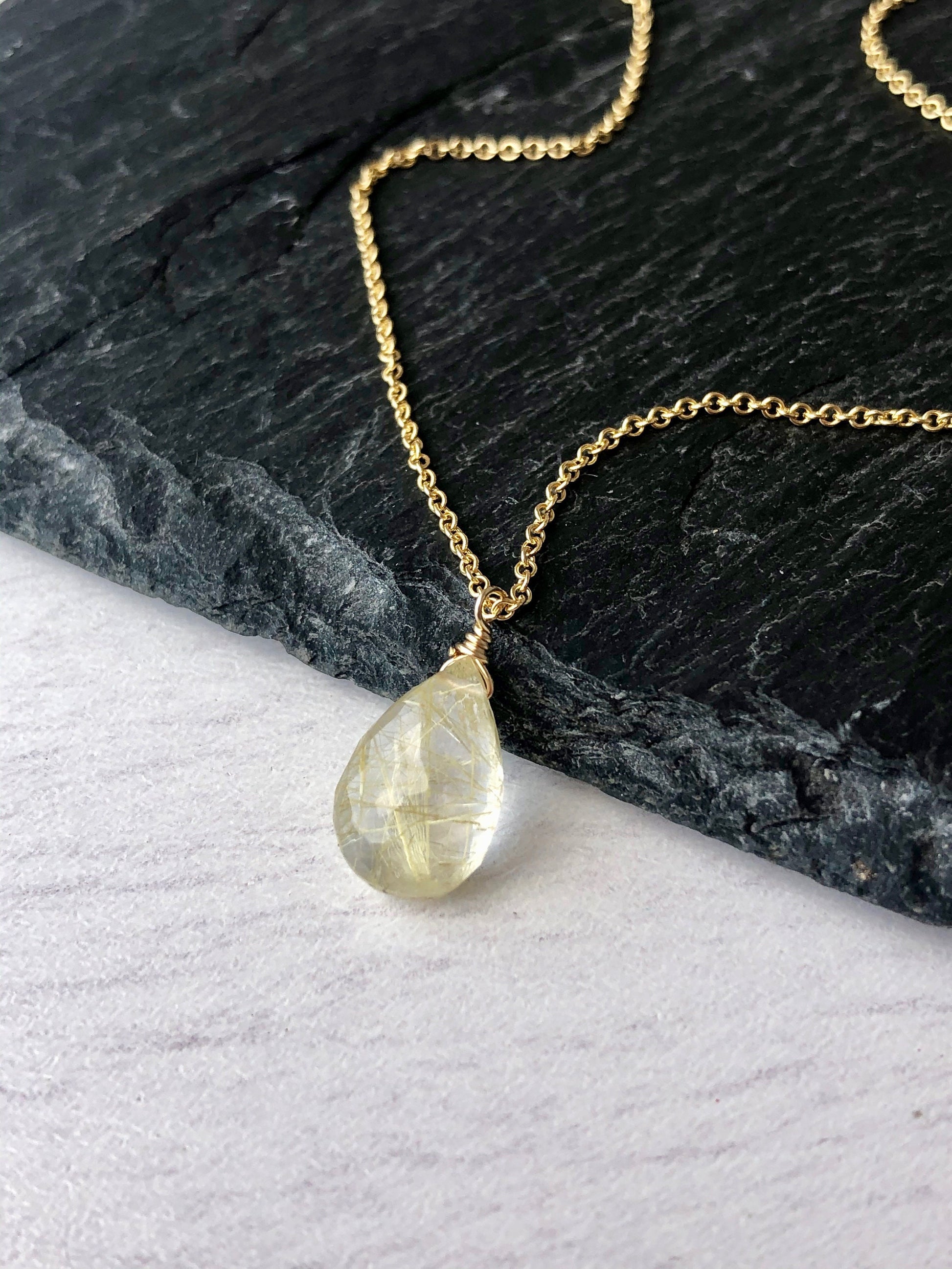 This simple dainty necklace features a genuine flawless quality rutilated quartz teardrop pendant wire wrapped in your choice of 14k Gold Filled or Sterling Silver. The golden tourmalinated quartz pendant is suspended from a delicate chain in the finish of your choice. This is a 100% natural quartz gemstone, full of healing properties. The golden inclusions and fractures on the stone are absolutely normal and to be expected in this type of gemstone.