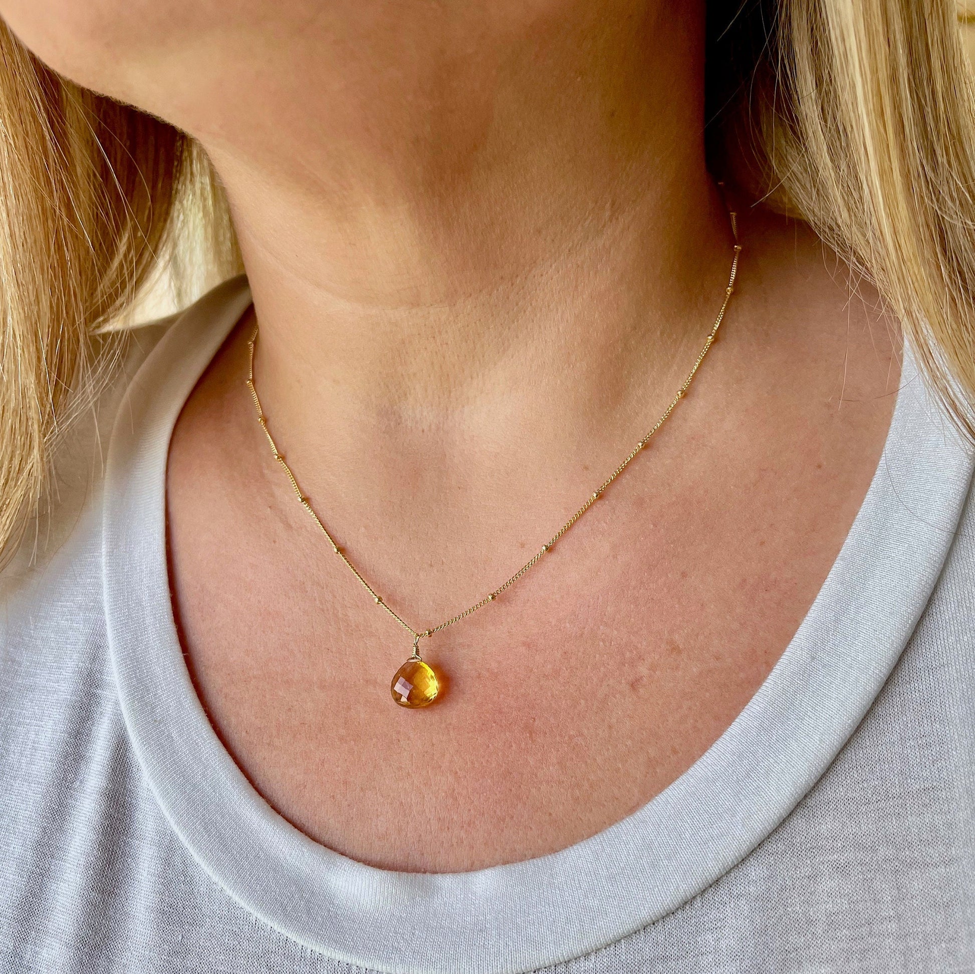 This handmade necklace features a genuine Yellow Topaz teardrop suspended from a delicate 14k Gold Filled or Sterling Silver satellite chain. This is a 100% natural yellow topaz and full of healing properties.